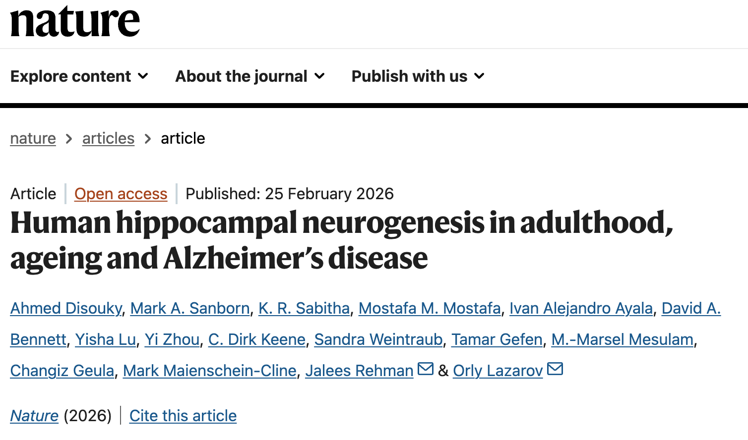 Disouky, A., Sanborn, M. A., Sabitha, K. R., Mostafa, M. M., Ayala, I. A., Bennett, D. A., … Lazarov, O. (2026). Human hippocampal neurogenesis in adulthood, ageing and alzheimer’s disease.