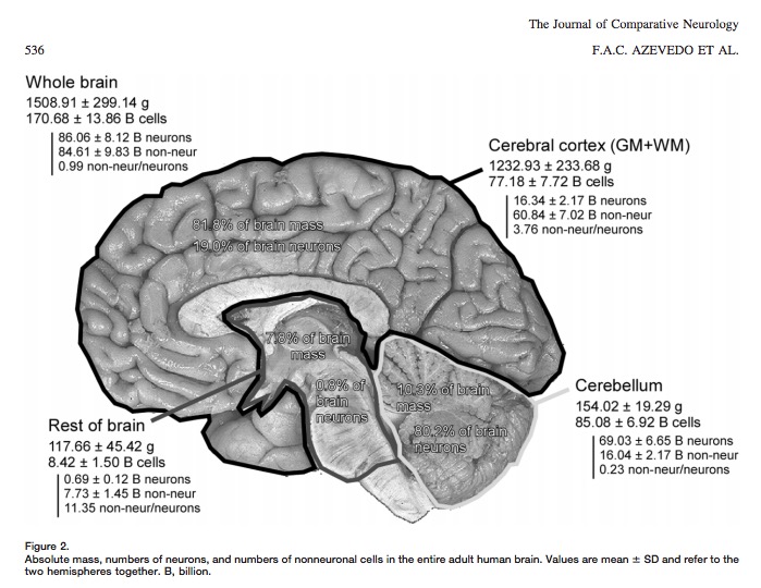 “These findings challenge the common view that humans stand out from other primates in their brain composition and indicate that, with regard to numbers of neuronal and nonneuronal cells, the human brain is an isometrically scaled-up primate brain.”