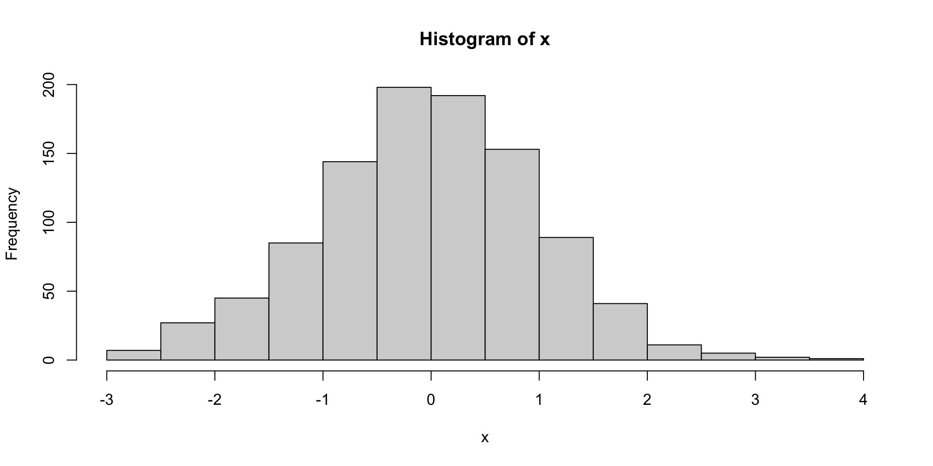 Figure 1: Histogram of a random normal sample of \(n\)=1000.