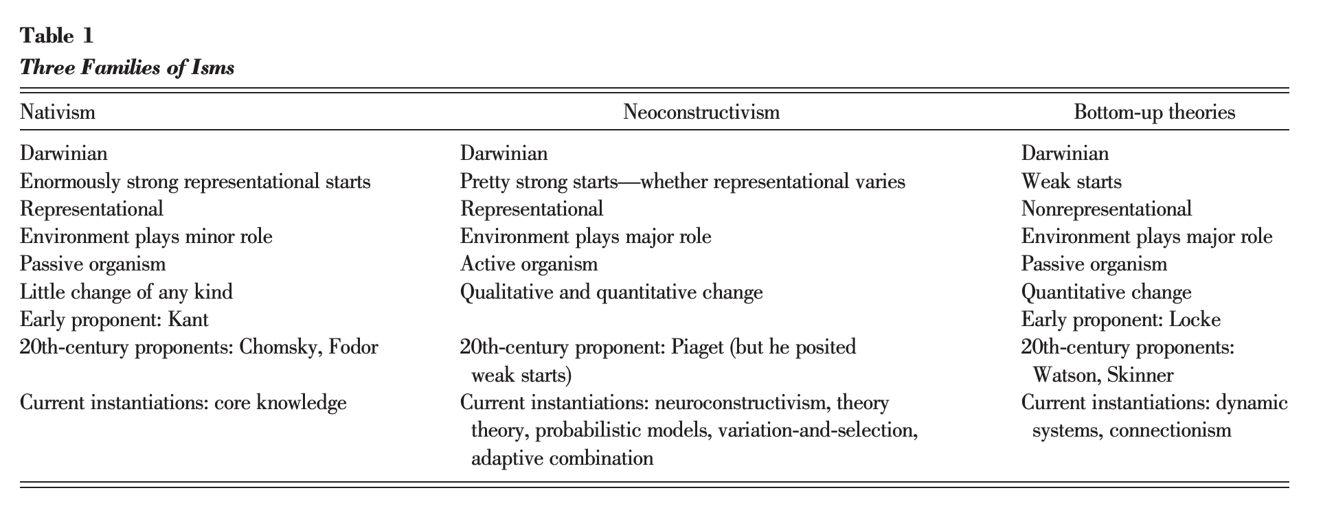 Nativism solves the first of Piaget’s problems by definition—by postulating the richest starting points imaginable, ones that encompass all the ‘‘core knowledge’’ required to understand the world…