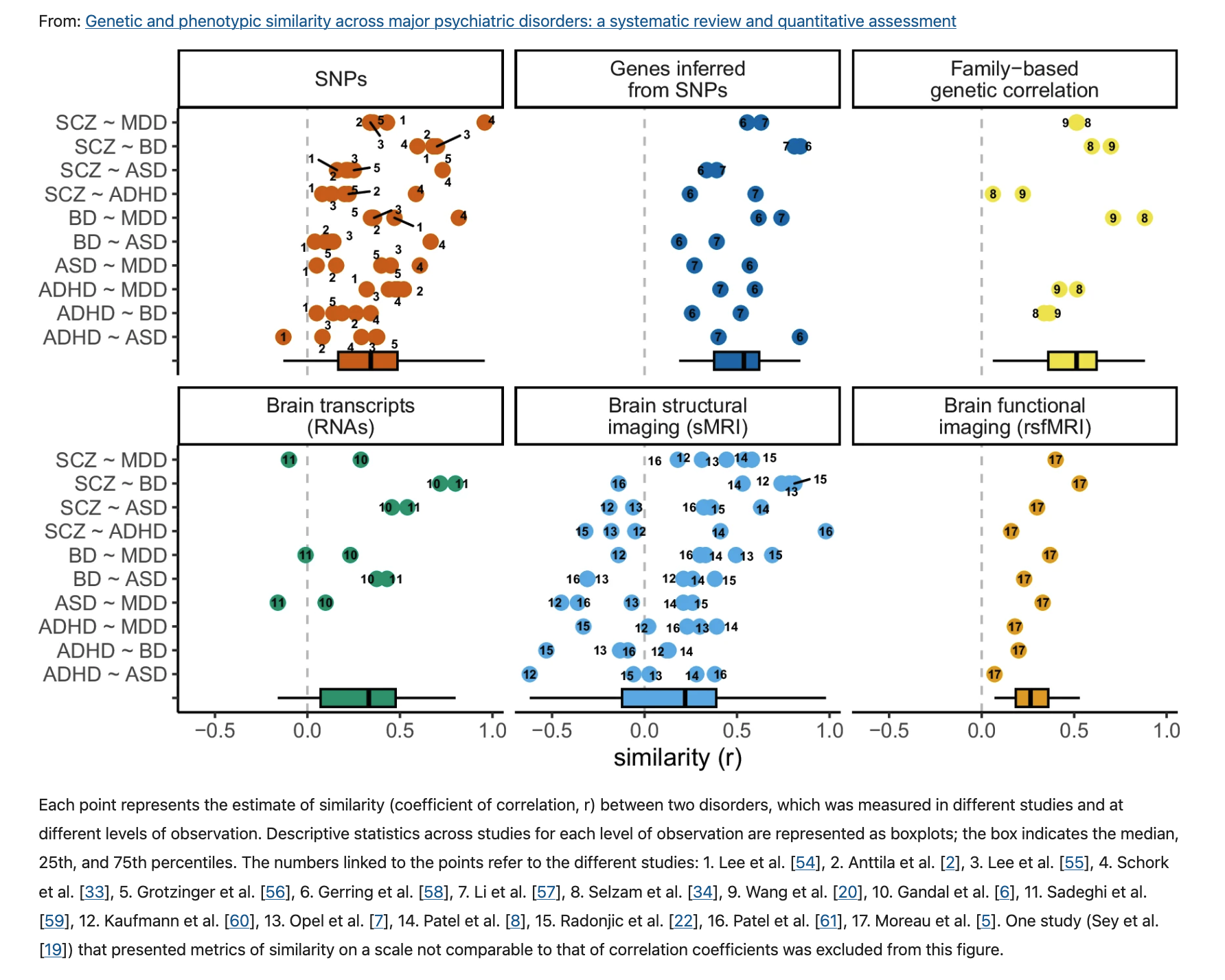 Bourque, V.-R., Poulain, C., Proulx, C., Moreau, C. A., Joober, R., Forgeot d’Arc, B., … Jacquemont, S. (2024). Genetic and phenotypic similarity across major psychiatric disorders: A systematic review and quantitative assessment.