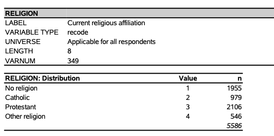 $ RELIGION    : num [1:8247] 1 1 1 1 1 1 1 3 3 3 ...