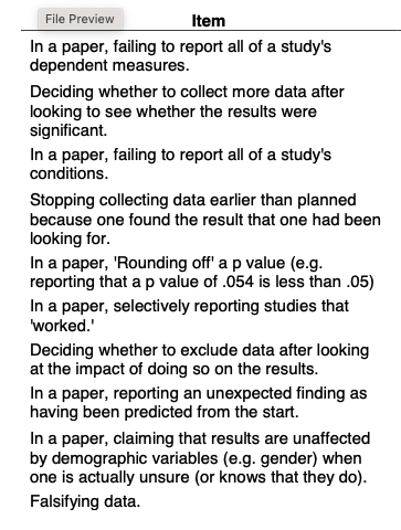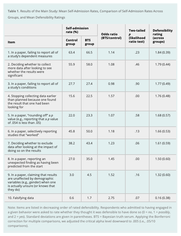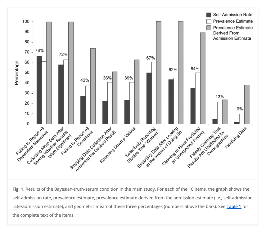 John, L. K., Loewenstein, G. & Prelec, D. (2012). Measuring the prevalence of questionable research practices with incentives for truth telling. Psychological Science, 23(5), 524–532. https://doi.org/10.1177/0956797611430953