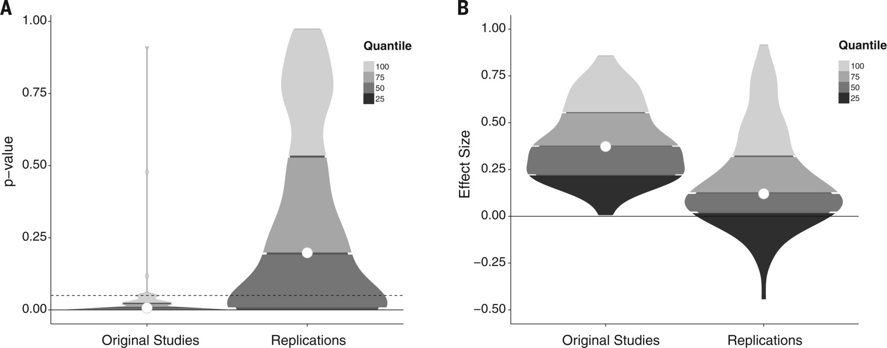 Figure 1 from Collaboration (2015); Density plots of original and replication P values and effect sizes. (A) P values. (B) Effect sizes (correlation coefficients). Lowest quantiles for P values are not visible because they are clustered near zero.