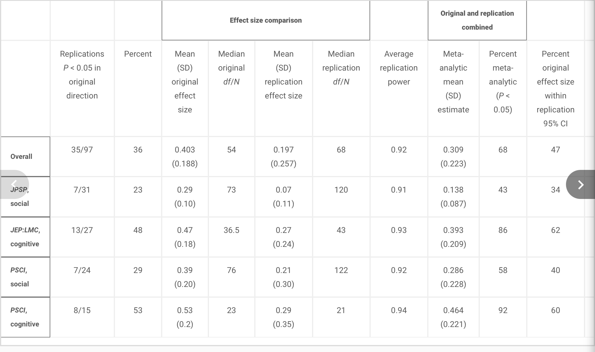 Table 1 from Collaboration (2015). Summary of reproducibility rates and effect sizes for original and replication studies overall and by journal/discipline.