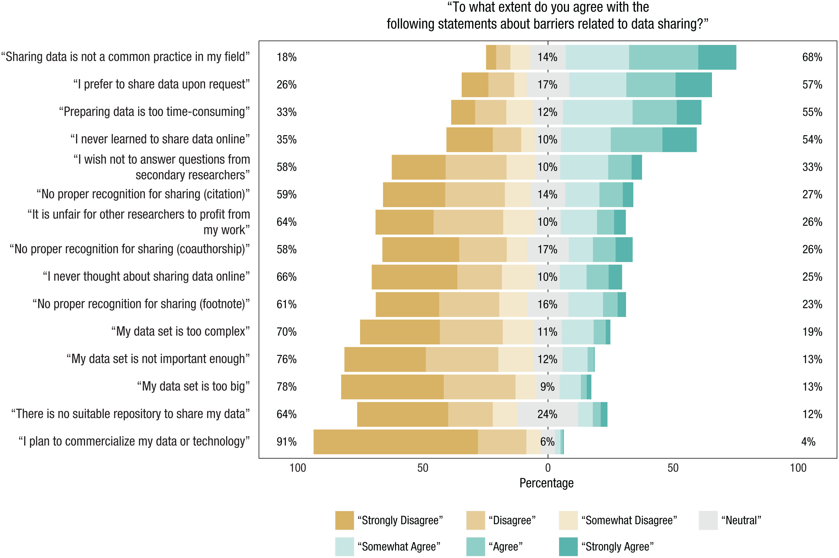 • The non-fear-related barriers to data sharing most frequently reported by respondents were that (a) sharing is not a common practice in their field, (b) they prefer to share their data only upon request, (c) they consider preparing data for sharing to be excessively time-consuming, and (d) they have never learned to share data online.