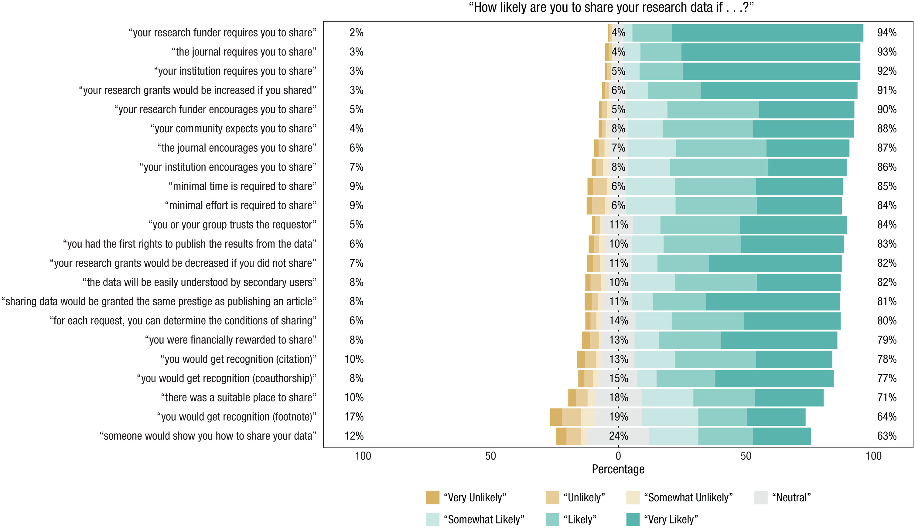• Mandatory data sharing (enforced by institutions, journals, or funders) and financial encouragement (i.e., increased grant amounts) are measures that would apparently be highly effective in increasing researchers’ willingness to share their data.