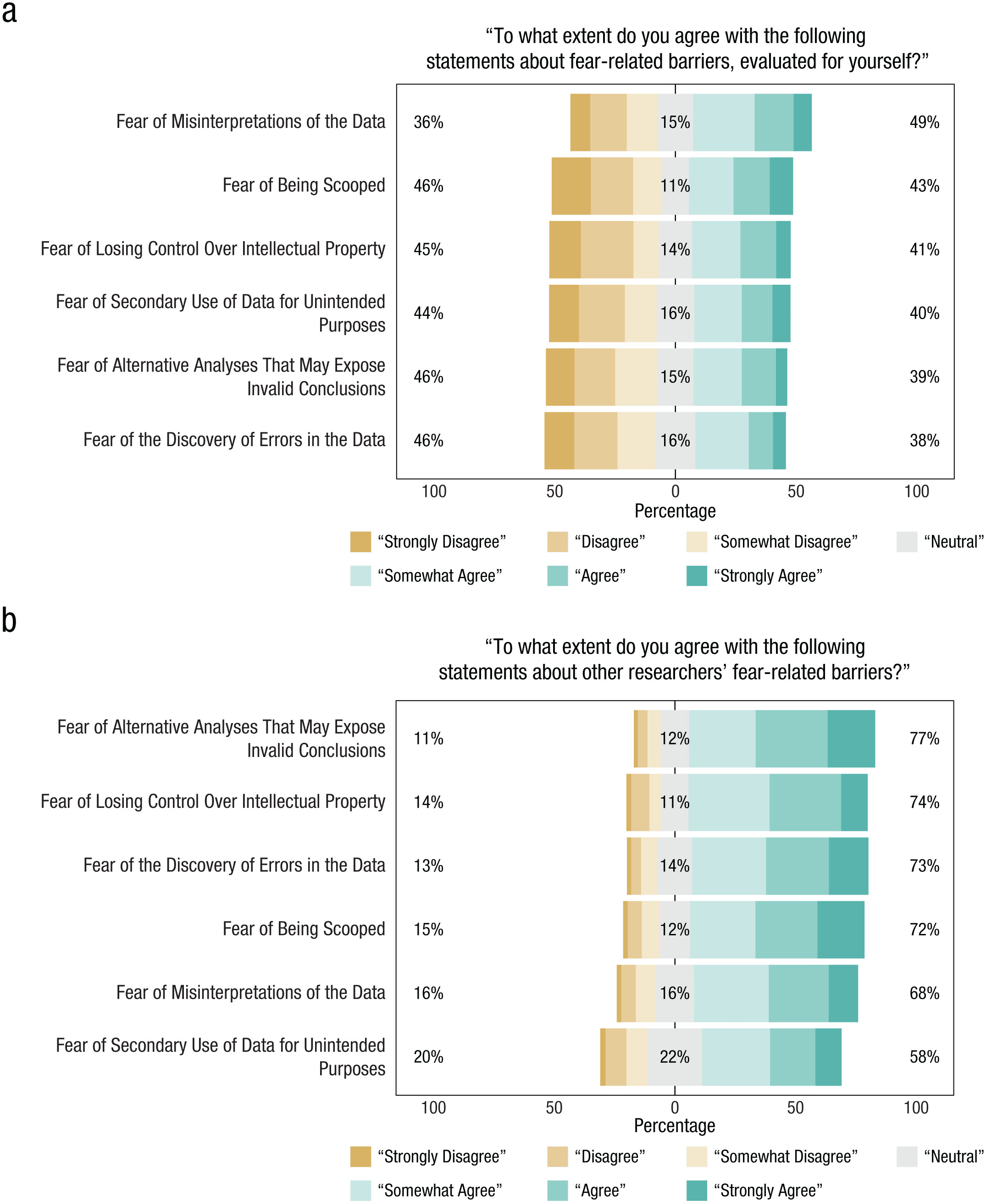 • In general, respondents felt that fear-related barriers affected other researchers more strongly than themselves.