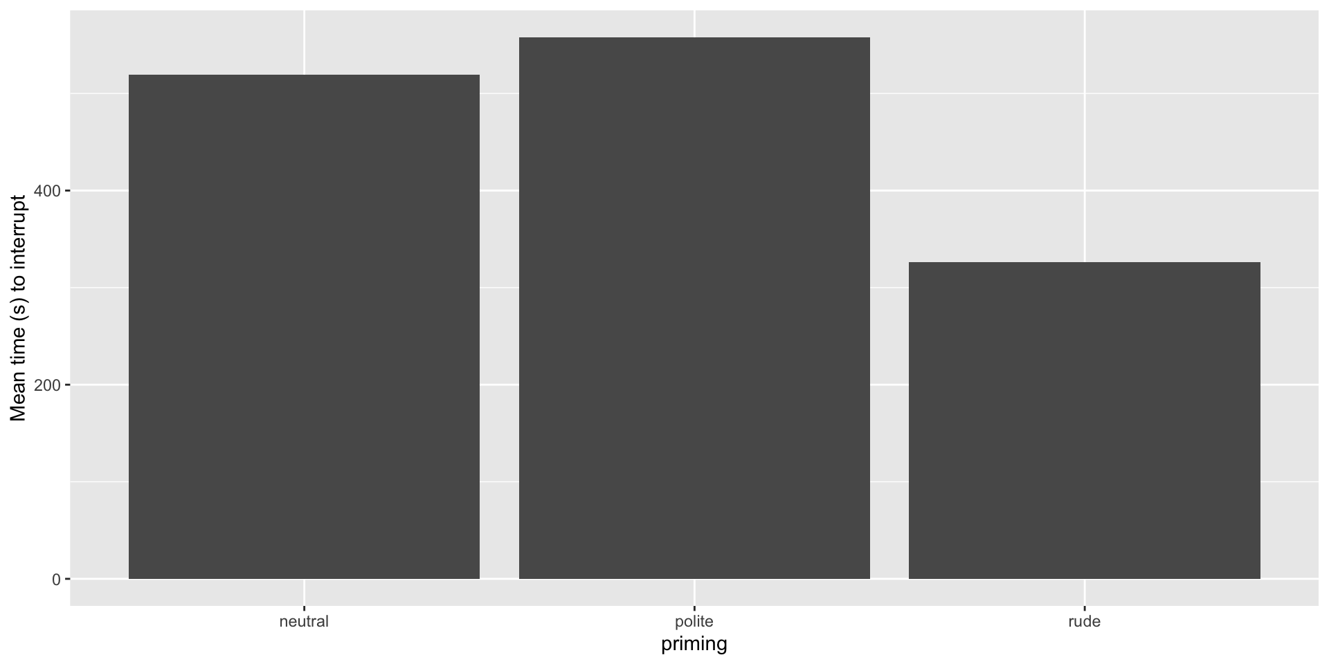 A one-way analysis of variance (ANOVA) of these data, with priming condition as the single factor, revealed a significant main effect, F(2, 33) = 5.76, p=.008. Participants in the rude priming condition interrupted significantly faster (M = 326 s) than did participants in the neutral (M = 519 s) or polite (M = 558 s) priming conditions.