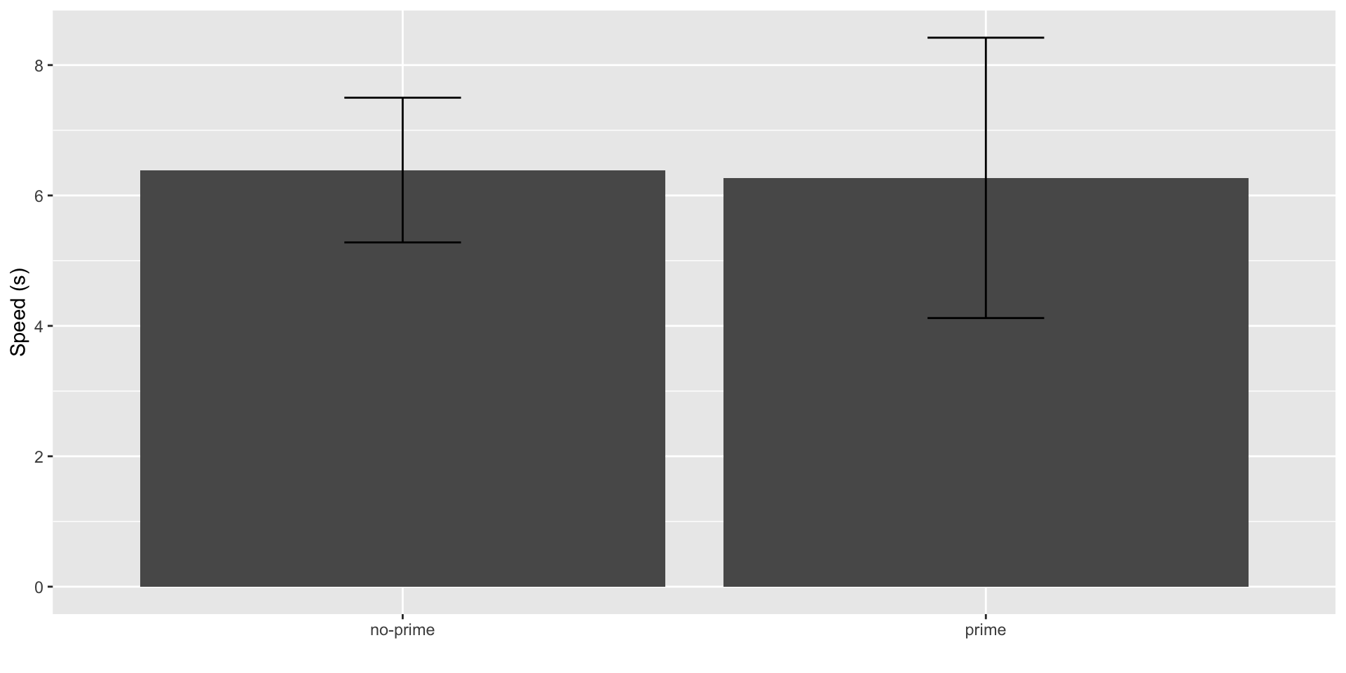 Walking speed: In this analysis, we used participants’ walking speed as they entered the experiment room, (i.e., before priming) as a covariate. The results show no significant difference between the Prime (M=6.27 SD=2.15) and the No-Prime group (M=6.39 SD=1.11) in the time necessary to walk along the hallway after the priming manipulation (F (1, 119)<1, \(\eta^2\)=.01).