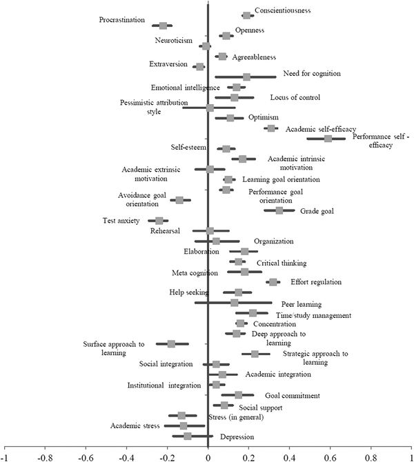 Richardson, Abraham, & Bond (2012). Figure 1: Results of the primary meta-analyses for the non-intellective correlates of GPA: r + and 95% confidence intervals.