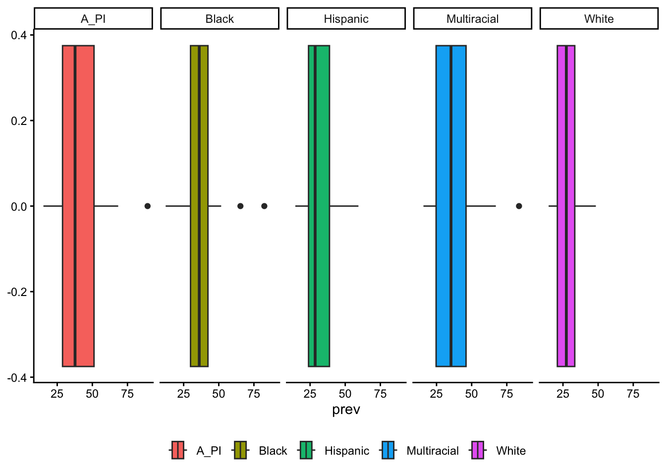 legend.position = "bottom")Warning in geom_boxplot(aes(x = prev, fill = race), bins = 5): Ignoring unknown