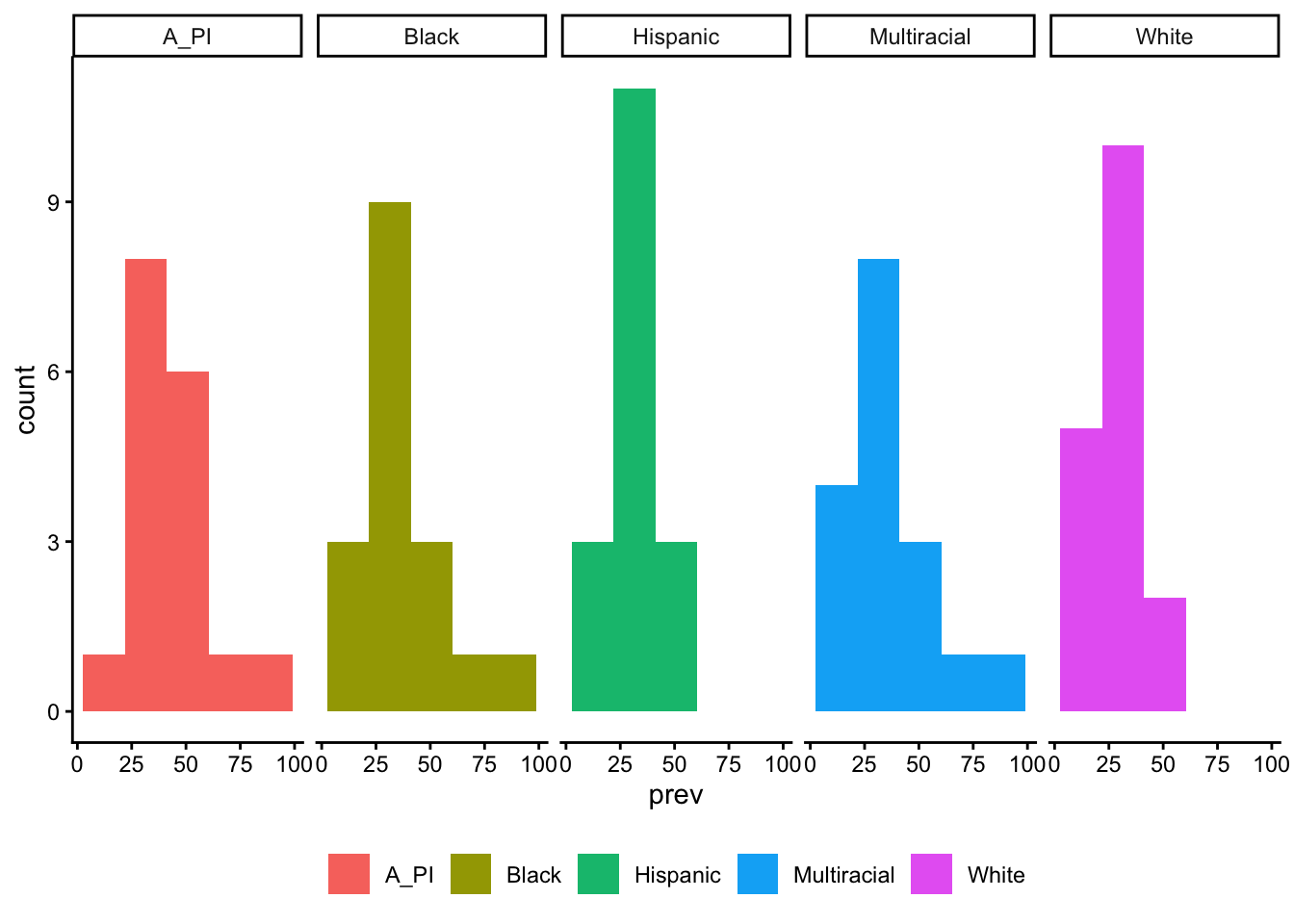 geom_histogram(aes(x = prev, fill = race), bins = 5) +