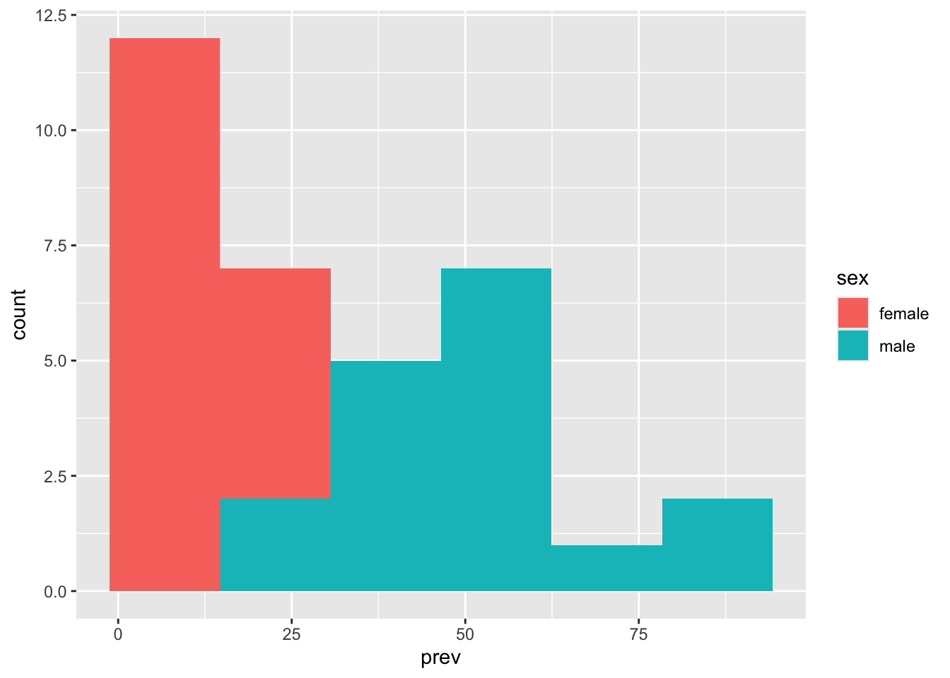 geom_histogram(aes(x = prev, fill = sex), bins = 5) +